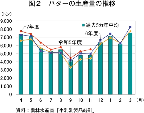 11月のバターの生産量は5512トン(前年同月比10.7%増)と、9カ月連続で前年同月を上回った(図2)。一方、出回り量は7462トン(同13.4%減)と、6カ月連続で下回った(農畜産業振興機構調べ)。在庫量については、15カ月連続で前年同月を上回り、11月末は2万9993トン(同27.5%増)となった(図3)。