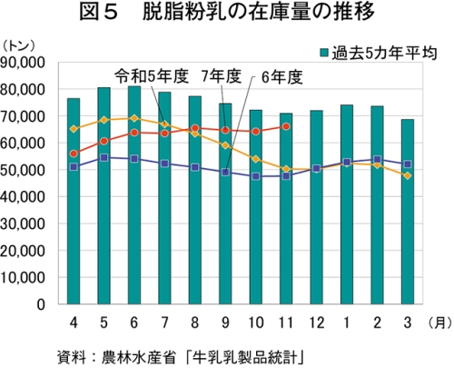 11月の脱脂粉乳の生産量は、1万1791トン(前年同月比5.5%増)と、9カ月連続で前年同月を上回った(図4)。一方、出回り量は1万138トン(同8.3%減)と、10カ月連続で下回った(農畜産業振興機構調べ)。在庫量は、前月まで2カ月連続で取り崩されたが11月末は再び積み上がり、6万6081トン(同38.8%増)と、12カ月連続で前年同月を上回った。(図5)。