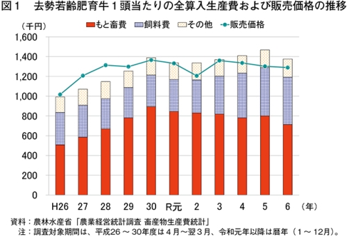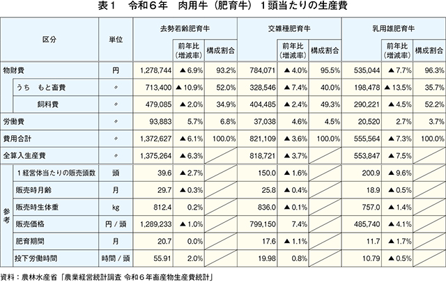 令和6年の去勢若齢肥育牛1頭当たりの全算入生産費(注1)は、137万5264円(前年比6.3%減)と、同統計開始以降で過去最高となった前年をかなりの程度下回った(表1、図1)。