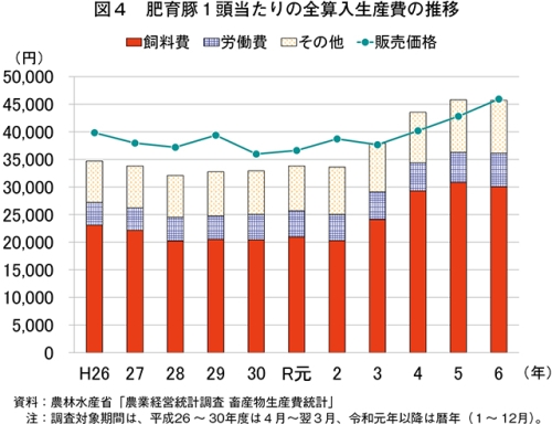 令和6年の肥育豚1頭当たりの全算入生産費は、4万5715円(前年比0.2%減)と、同統計開始以降(注3)で過去最高となった前年並みの水準であった(表2、図4)。