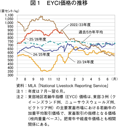 豪州食肉家畜生産者事業団(MLA)によると、肉牛生体取引価格の指標となる東部地区若齢牛指標(EYCI)価格は、直近2025年12月18日時点で1キログラム当たり858豪セント(917円:1豪ドル=106.82円(注1))と、12月に入り緩やかな下落傾向が続いている(図1)。