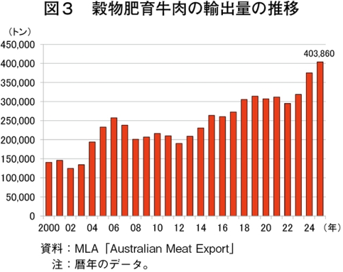 MLAはこの記録達成に関して、米国の相互関税など逆風の中で達成できたことは意義深いとし、米国向け加工用牛肉(90CL:赤身率90%のひき肉用)がこの伸びをけん引したことに加え、穀物肥育牛肉輸出量も過去最高を記録したことは、豪州産牛肉のプレミアム品質が世界市場で確固たる地位を確立したことを示していると説明した(図3)。