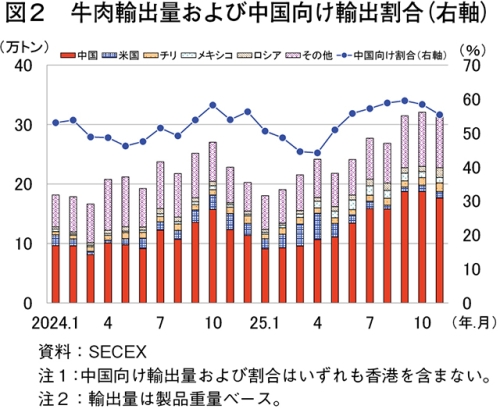 輸出先別に見ると、輸出量全体の半分以上を占める中国向けは149万8969トン(同24.0%増)となったほか、米国、チリ、メキシコおよびロシアを含めた上位5カ国が、いずれも前年同期を大幅に上回った。なお、累計では増加している米国向けであるが、単月で見ると6月以降は前年割れが続いている(図2)。そうした中、米国のトランプ大統領は25年11月14日、同年4月以降に導入した世界各国・地域に対する相互関税について、牛肉を含む特定の農産物などを対象外とする大統領令を発した(注1)。さらに、11月20日には、ブラジルに対して8月6日以降課していた40%の追加関税についても、同様の品目を対象外とする大統領令を発した。これらの措置により、今後米国向けの輸出量に影響が生じるとみられる。