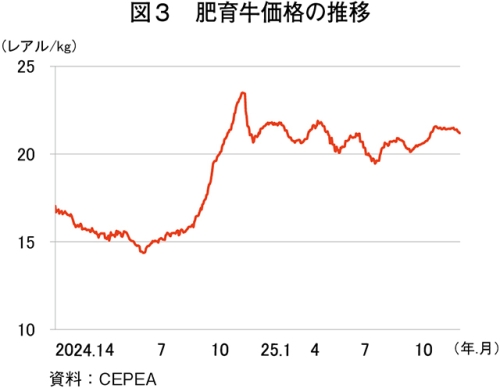 サンパウロ大学農学部応用経済研究所(CEPEA)によると、2025年12月19日時点の肥育牛価格は1キログラム当たり21.20レアル(607円:1レアル=28.63円(注2)、前年同日比0.8%高)となった(図3)。