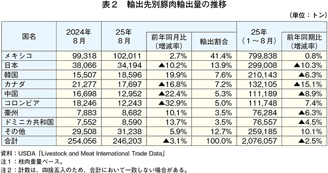 米国農務省経済調査局(USDA/ERS)によると、2025年8月の豚肉輸出量は主要輸出先における需要が弱まっていることから、24万6203トン(前年同月比3.1%減)とやや減少した(表2)。最大の輸出先となるメキシコ向けは、10万2011トン(同2.7%増)とわずかに、韓国向けは1万8596トン(同19.9%増)と大幅に、いずれも増加した。一方、日本向けは3万4194トン(同10.2%減)とかなりの程度減少した。中国向けは、米国産豚肉に追加関税が課されていることにより、同22.4%減と大幅に減少した。
