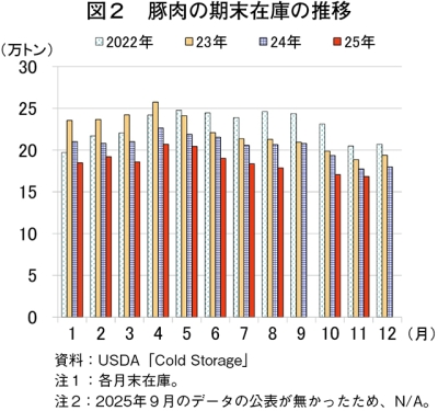 また、同月の豚肉期末在庫は生産量の減少などを背景に16万8405トン(前年同月比5.1%減)とやや減少した(図2)。