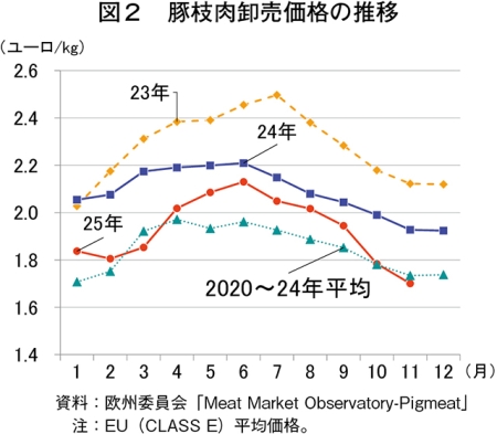 欧州委員会によると、2025年11月の豚枝肉卸売価格(EU27カ国)は、1キログラム当たり1.70ユーロ(316円:1ユーロ=185.83円(注1)、前年同月比11.8%安)となり、過去5カ年平均を下回った(図2)。これは、豚肉供給量が前年を上回って推移している影響が大きく、同価格は5カ月連続で前月を下回っている。なお、英国農業園芸開発委員会(AHDB)によれば、価格下落は供給量の増加に加え需要の減退も影響しているとされる。また、スペインでアフリカ豚熱(ASF)が確認されたこと(注2)が、今後EUにおける同価格の下落圧力になると見込まれている。