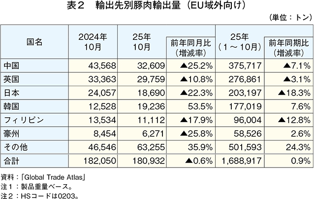 欧州委員会によると、2025年10月のEU域外への豚肉輸出量(EU27カ国)は18万932トン(前年同月比0.6%減)とわずかに減少した(表2)。中国によるアンチダンピング関税(注3)などの影響で、同国向け輸出は同25.2%減と大幅に減少した。さらに、前述のスペインでのASFの確認により、日本やフィリピン向けなどに輸出される豚肉などに伴う輸入停止措置による今後の輸出量の減少が予想される。