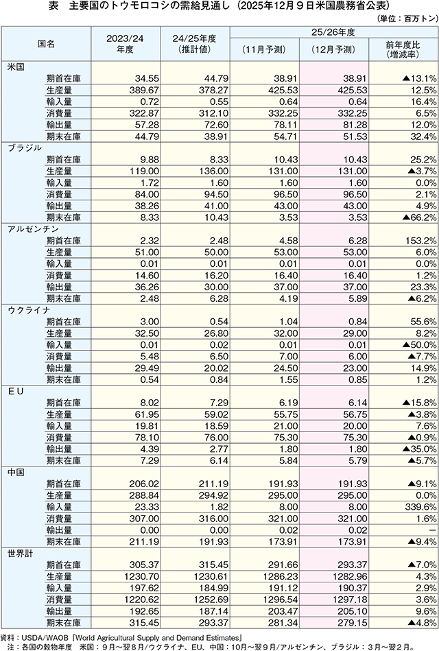 米国農務省世界農業観測ボード(USDA/WAOB)および米国農務省海外農業局(USDA/FAS)は2025年12月9日、2025/26年度の世界のトウモロコシ需給予測値を更新した(表)。