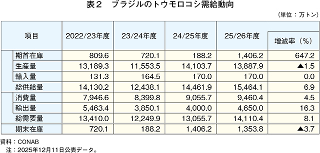 2025/26年度のトウモロコシ生産量は、前回(25年11月)より4万2000トン上方修正の1億3887万9000トン(前年度比1.5%減)と見込まれ、これは過去最大となった24/25年度に次ぐ大きさとなる(表1、図1〜2)。