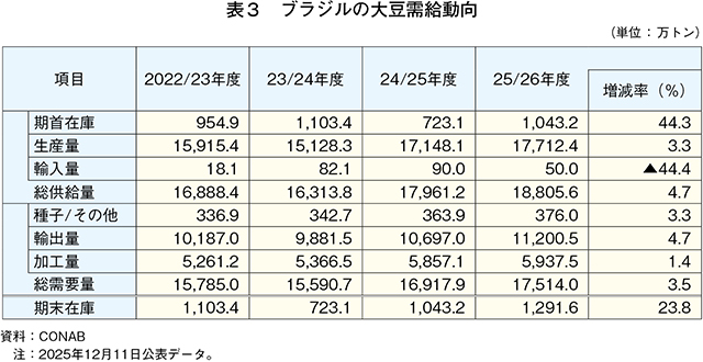 25/26年度の大豆需給を見ると、生産量が下方修正されたことで、輸出量も前回から10万3000トン下方修正され1億1200万5000トン(同4.7%増)となったものの、前年度をやや上回ると見込まれている(表3)。また、輸出量が増加する見込みにもかかわらず、期末在庫は前年度を大幅に上回ると見込まれている。