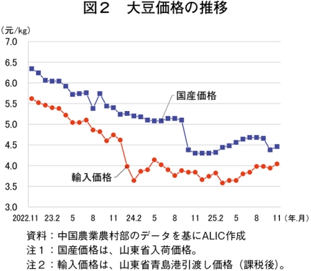 各地の価格動向を見ると、主産地である黒竜江省の食用向け国産大豆平均取引価格は、25年11月が1キログラム当たり3.92元(89円、前年同月比2.0%高)と前年同月をわずかに上回った。また、大豆の国内指標価格の一つとなる山東省の国産大豆価格は、同4.46元(101円、同3.8%高)と前年同月をやや上回った。同月の輸入大豆価格は同4.04元(92円、前月比2.5%高)となったが、輸入価格の上昇幅が国産価格の上昇幅を上回ったことで、輸入と国産の価格差は縮小した。