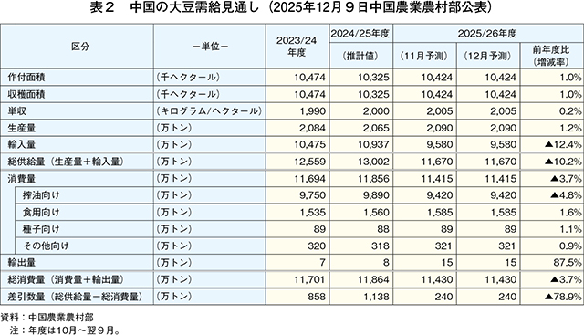 同年度の大豆生産量は、作付面積および単収の増加により、2090万トン(同1.2%増)と見込まれている(表2)。