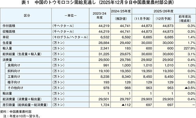この中で、2025/26年度(10月〜翌9月)のトウモロコシ生産量は、作付面積および単収の増加により、前年度に続き過去最高となる3億トン(前年度比1.7%増)と見込まれている(表1)。