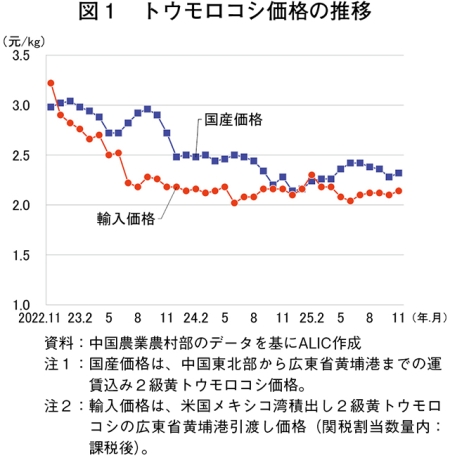 輸入トウモロコシ価格を見ると、養豚主産地の中国南部向け飼料原料集積地となる広東省黄埔港到着価格は、25年11月が1キログラム当たり2.14元(48円:1元=22.66円(注)、前月比1.9%高)とわずかに上昇した。また、同月の国産トウモロコシ価格(東北部産の同港到着価格)は同2.32元(53円、前月比1.8%高)となったが、国産価格の上昇幅が輸入価格の上昇幅を上回ったことから、輸入品と国産品の価格差は拡大した。