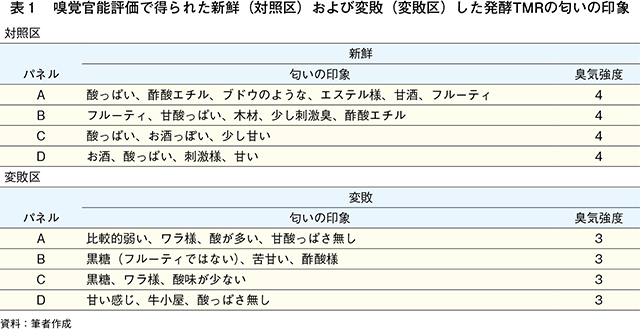 開封から一定期間を経た発酵TMRを用いて、和牛による嗜好性試験を実施した。嗜好性試験には、開封後13日間経過した発酵TMRを給与する変敗区と、試験当日の朝に開封する対照区を設けた。変敗区の発酵TMRは、開封後、ほぐしてから山積みにして好気条件で放置(1日1回攪拌)し、品温が30度以上になったことを確認してから試験に用いた。嗜好性試験は、黒毛和種育成牛4頭(平均月齢8.5カ月、平均体重238.8kg)を供試し、一対比較法で行った。一対比較法は、2種類の発酵TMRを左右別々の飼槽に同時に給与し、150分間の採食量をそれぞれ測定する方法で行った。牛が片方の飼槽の飼料を好んで摂取する可能性の影響(飼料の位置の影響)を排除するため、給与開始から30分後に左右の飼料の位置を入れ替えた。試験終了時に残飼を個別に回収し、重量を測定するとともに、給与量の差から飼料摂取量を算出した。嗜好性試験における飼料摂取量の差を分散分析により統計解析を行った。嗜好性試験に用いた発酵TMRサンプルは、嗜好性試験当日の朝に採取し、嗅覚官能評価および発酵品質等評価に用いた。
