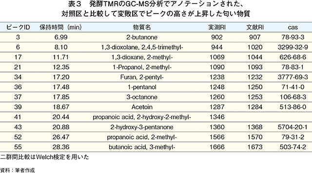 匂い物質を含む幅広いVOCsを検出するため、ガスクロマトグラフィー質量分析計(TQ8040:島津製作所、京都。以下「GC-MS」という)を用いたGC-MSノンターゲット分析に着手した。分析にはGC-Oと同じWAXカラムを、検出にはElectron Impact(EI)スキャンモード(m/z 40-250)を用いた。分析前に混合アルカン溶液(C6〜C30)を測定し、RIを算出した。捕集済みMonoTrapに内部標準物質(シクロヘキサノン:1 ナノグラム〈ng〉相当)を添加し、HandyTDを用いて注入した。物質の仮同定(アノテーション)には、匂い物質に特化したデータベースであるAromaOffice(西川計測、東京)を用いた。AromaOfficeアロマサーチを用い、マスクロマトグラムをデコンボリューションするとともに、RIデータベースおよびマススペクトルライブラリ(NIST14)を同時検索することで物質を特定した。検索結果において、ライブラリ検索の一致率が70%以上、かつRIの差異が±30以内の物質をリストアップした。仮同定物質リストは、多変量解析で利用した。