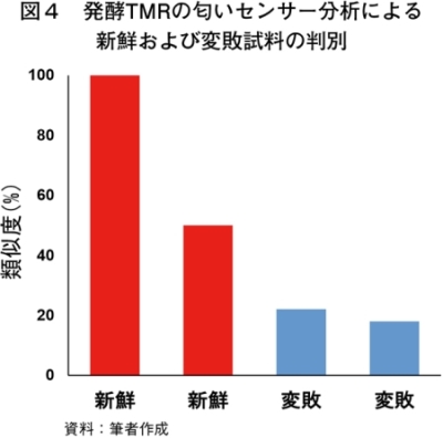 匂いセンサーとして、匂い識別装置(FF-2、島津製作所)を用いた。試料は、発酵TMRを3グラム(g)分取してサンプリングバッグ(3リットル)に封入し、高純度窒素ガス約2リットルを注入したものを40 ℃の乾燥庫内で1時間静置した。乾燥庫内からバッグを取り出して室温になじませたのち、新しいサンプリングバッグ(3リットル)の口と口とをテフロンチューブで接続し、ヘッドスペースガスのみを新しいバッグに移したものをサンプルガスとした。