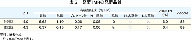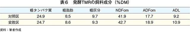 発酵TMRサンプルについて、変敗の指標として、発酵品質、飼料成分、微生物生菌数およびアミノ酸組成を測定した。発酵品質では、pH(水素イオン濃度)、揮発性塩基態窒素(VBN)/全窒素(T-N)および有機酸を測定した。pHは、ガラス電極pHメーターにより測定した。VBNは微量拡散法、T-Nは燃焼法(改良デュマ法)窒素・タンパク質測定装置(デュマサーム、ゲルハルト・ジャパン)で測定した。有機酸含量の測定は、高速液体クロマトグラフィ(HPLC)による方法で行った。飼料成分は粗脂肪(EE)、CP、粗灰分(CA)、中性デタージェント繊維(NDFom)、酸性デタージェント繊維(ADFom)および酸性デタージェントリグニン(ADL)を常法により定量した。微生物生菌数の測定は、平板培養法を用いて行った。サンプリングおよび分注したコンパクトドライ(YMおよびTC、ニッスイ)を25℃で3〜5日間培養し、一般細菌、カビおよび酵母の生菌数をカウントした。生菌数(CFU/gFM)はカウント数×希釈率を用いて行った。アミノ酸の分析では、試料を6N塩酸で110℃、24時間の酸加水分解後、高速アミノ酸分析計(L-8900、日立ハイテクノロジーズ)により測定した。