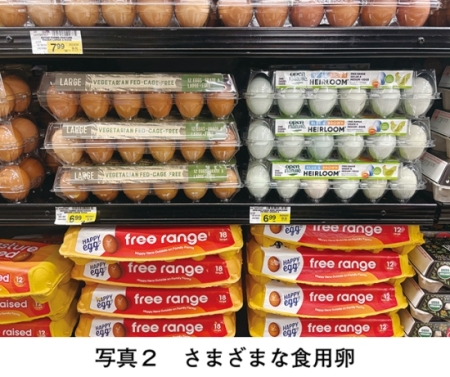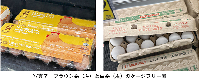 なお、つつきやいじめの防止策として、ロードアイランドレッドなどブラウン系の気性が穏やかな品種の選別や、育種改良の動きも一部見られるものの、白色レグホーンなどの従来種の方が生産性に優れることもあり、小売店でも両者は併存している(写真7)。