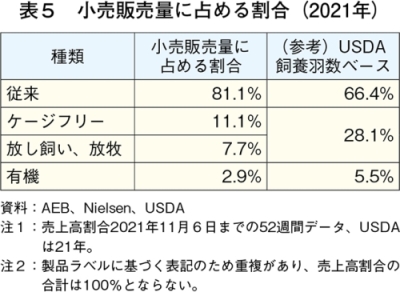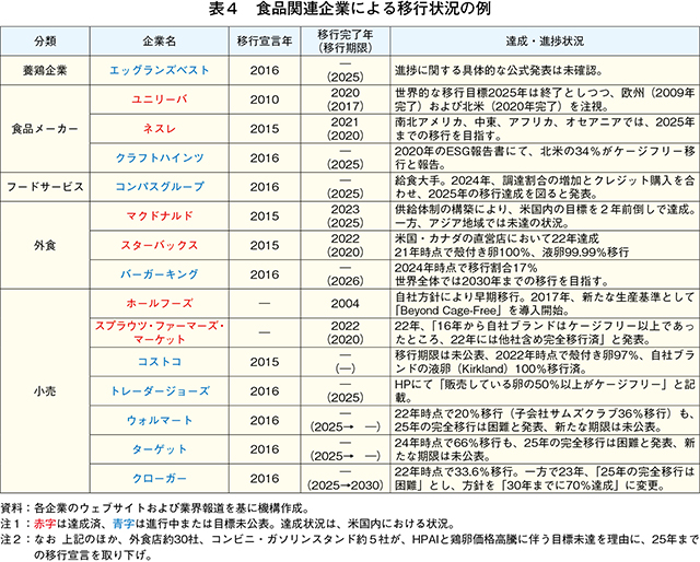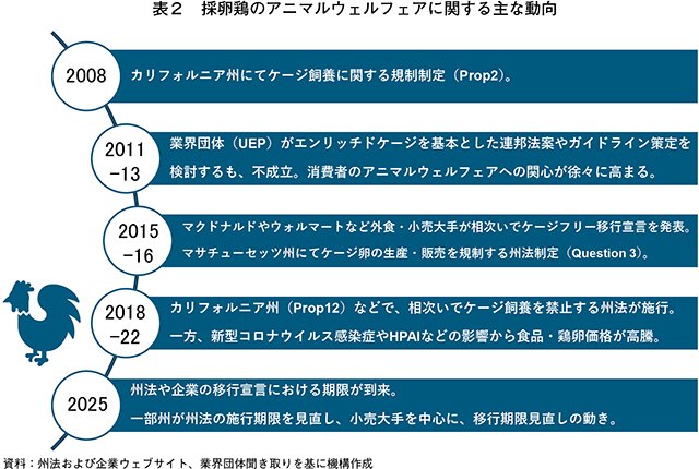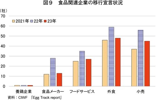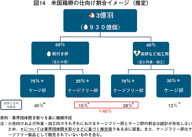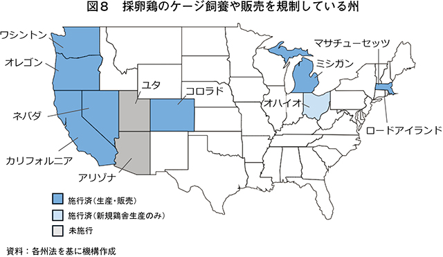 生産者にとってケージフリー化の対応は、新規鶏舎の建設や設備投資、追加の飼養管理などのコスト(費用)を要する。それにも関わらずケージフリーへの移行に踏み切ったのは、州規制や企業の移行宣言を背景に、企業との既存の供給契約を維持するためであったとみられている(注11)。