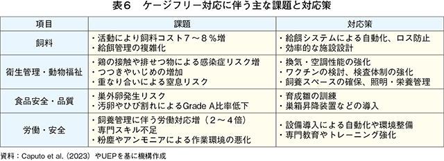 ケージフリー飼養の場合、減価償却費を含まない飼養管理コストは、ケージ飼養に比べて8〜19%増加すると見積もられている。これは、飼料費や労働費などが追加で必要となるためである。飼養管理上の主な課題としては、1)活動に伴う飼料コスト増、2)ふん尿による汚卵や疾病リスク、3)カニバリズム(つつき、いじめ)や鶏の重なり合いによる窒息の発生、4)これらの対応に伴う労働コスト増―などがある(表6)。また、育成雛の段階から、巣箱周辺を暗くする照明制御により巣箱産卵を習慣化して床卵(注13)を防いだり、止まり木の使用や段差移動を習慣付けたりするといった訓練も必要となる(注14)。こうした対応には、設備導入による改善に加え、従業員のトレーニングや追加労働を要する。