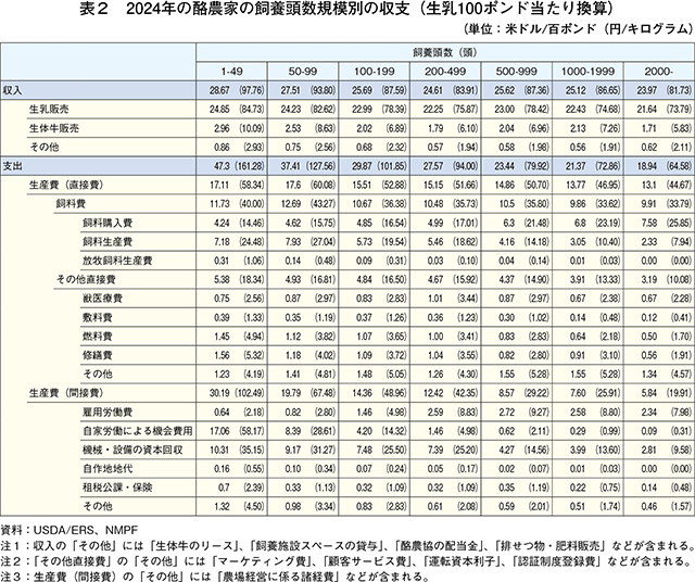 また、規模別の統計を見ると、小規模農場においては、生乳販売や生体牛販売などの収入割合が高い一方、機械・設備の資本回収費の支出割合も高くなっている(表2)。これは小規模農場にとっては、設備投資へのコストが相対的に大きくなっているということであり、逆に言えば、十分な設備投資を実施するためには、例えば1農場当たり500〜1000頭程度以上の規模でなければ、生乳販売、生体牛販売などによる収入のうち2割以上を機械・設備の資本回収費が占めるなど、設備投資負担を吸収しにくい構造であることになる。