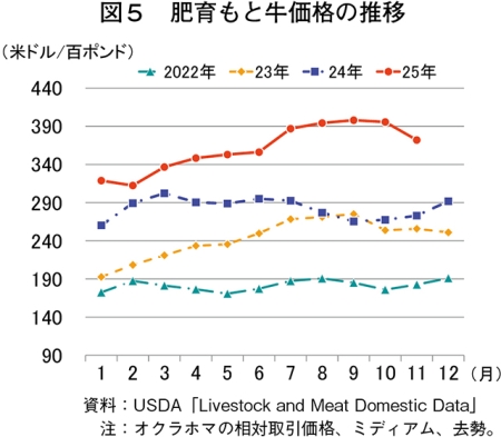 米国の酪農場においては、近年アンガス牛などの肉用牛を乳用牛に種付けする農場も増加しており、酪農場における肥育用の交雑種の生産割合も上昇傾向にある(写真3)。この背景には、現在肉牛の飼養頭数が約70年ぶりの低水準で推移しており、肥育用のもと牛についても市場においては高値で推移していることがある(図5)。肉用牛の牛群再構築が進展しない中、酪農家にとっては、生体牛の販売は重要な収入源となっている。酪農関係者への聞き取りの中では、最近乳用牛の併用年数を延長する傾向が見られており、1頭当たりの乳量が多少落ちたとしても、産子数を増加させて生乳生産を継続する動きがあるとのことである。