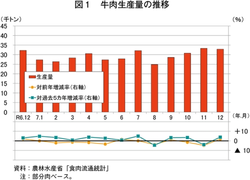 令和7年12月の牛肉生産量(注1)は、3万2843トン(前年同月比1.9%増)と前年同月をわずかに上回った(図1)。品種別では、和牛は1万8047トン(同4.6%増)、交雑種は8859トン(同4.4%増)と、ともに前年同月をやや上回った一方、乳用種は5890トン(同8.4%減)と前年同月をかなりの程度下回った。