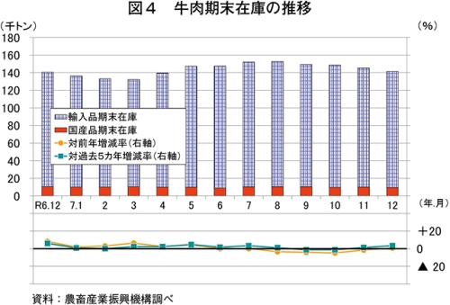 12月の推定期末在庫は、14万1523トン(前年同月比0.7%増)と前年同月をわずかに上回った(図4)。このうち、国産品は9562トン(同10.6%減)と前年同月をかなりの程度下回った一方、在庫の大半を占める輸入品は13万1961トン(同1.7%増)と前年同月をわずかに上回った。