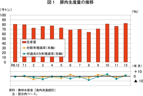 令和7年12月の豚肉生産量は、8万2651トン(前年同月比2.5%増)と前年同月をわずかに上回った(図1)。