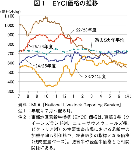 豪州食肉家畜生産者事業団(MLA)によると、肉牛生体取引価格の指標となる東部地区若齢牛指標(EYCI)価格は、直近2026年1月30日時点で1キログラム当たり840豪セント(924円:1豪ドル=109.96円(注1))と高水準を推移しているものの、1月中旬から緩やかに下落している(図1)。