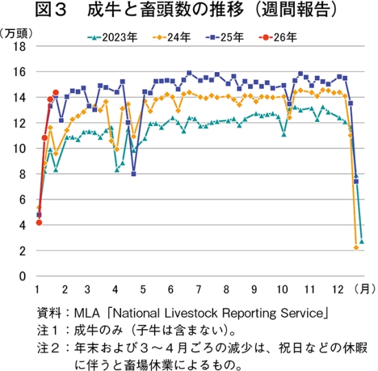 2026年1月第4週の成牛と畜頭数は、14万3640頭(前年同期比1.9%増)と、昨年に引き続き年初から高水準で推移している(図3)。
