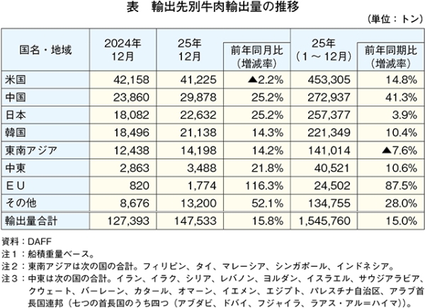豪州農林水産省(DAFF)によると、2025年12月の牛肉輸出量は14万7533トン(前年同月比15.8%増)とかなり大きく増加し、25年の累計は154万5760トン(同15.0%増)と過去最高値を記録した(表)。