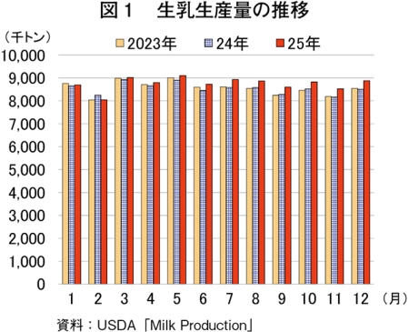米国農務省全国農業統計局(USDA/NASS)によると、2025年12月の乳用経産牛飼養頭数は956万7000頭(前年同月比2.3%増)とわずかに増加した。同月の生乳生産量は、乳用経産牛飼養頭数および1頭当たり乳量(同2.0%増)の増加により、887万6000トン(同4.4%増)とやや増加した(図1)。米国農務省経済調査局(USDA/ERS)によると、26年の生乳生産量は1億627万7000トン(前年比1.3%増)と見込んでいる。