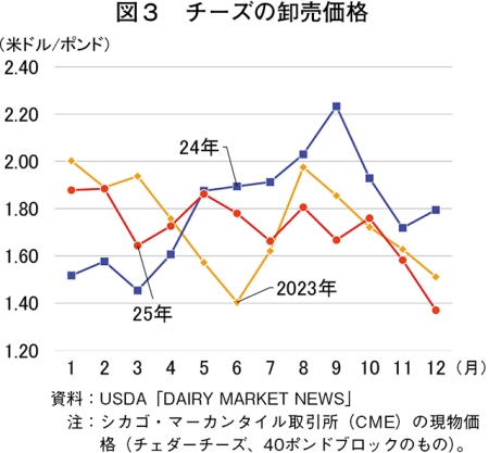 米国農務省農業マーケティング局(USDA/AMS)によると、2025年12月の1ポンド当たりの卸売価格は、バターが前年同月比43.0%安の1.44米ドル(1キログラム当たり492円:1米ドル=154.66円(注))、チーズが同23.7%安の1.37米ドル(同467円)とそれぞれ前年同月を大幅に下回った(図2、3)。バター、チーズともに堅調な生乳生産による供給過多や国内需要が軟調であることを背景に、卸売価格は下落傾向で推移している。