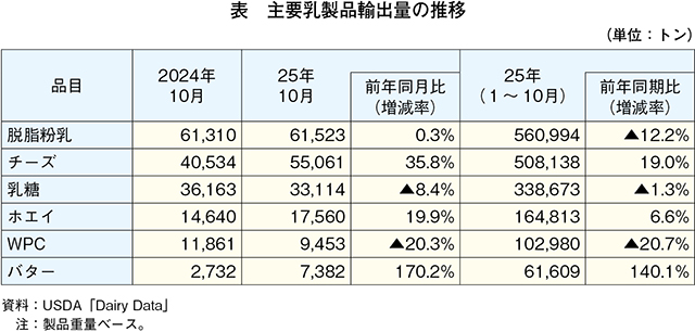 米国農務省経済調査局(USDA/ERS)によると、2025年10月の乳製品輸出量は、乳脂肪分ベースでは前年同月比50.0%増と大幅に、無脂肪ベースでも同0.9%増とわずかに、いずれも増加した。