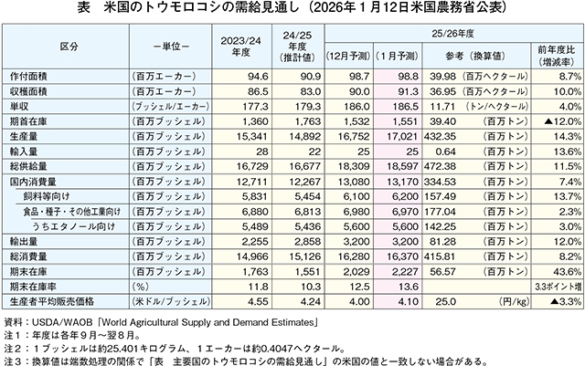 米国農務省世界農業観測ボード(USDA/WAOB)は2026年1月12日、2025/26年度(9月〜翌8月)の米国のトウモロコシ需給見通しを更新した(表)。