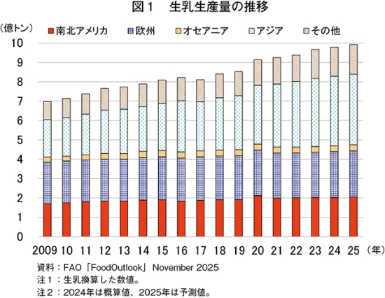 2024年の世界の生乳生産量(水牛乳を含む)は、9億7897万トン(FAO Food Outlook、2025年11月)と見込まれている。飼養環境や飼料効率の改善、育種改良による1頭当たり乳量の増加から、特にインドやパキスタンで増加しており、世界全体でも増加傾向で推移している(図1)。