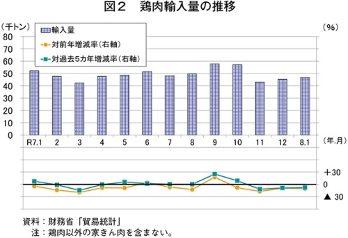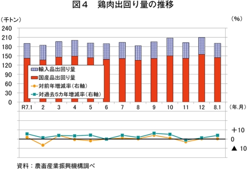 令和8年1月の鶏肉生産量は、14万4742トン(前年同月比4.4%増)と前年同月をやや上回った(図1)。