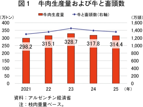 アルゼンチン経済省によると、2025年の牛と畜頭数は1358万8000頭(前年比2.5%減)、牛肉生産量は314万4000トン(同1.1%減)と、いずれも前年をわずかに下回った(図1)。