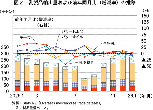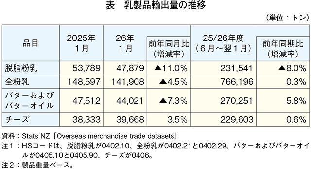 ニュージーランド統計局(Stats NZ)によると、2026年1月の乳製品輸出量は、チーズを除く主要3品目で前年同月を下回った(表、図2)。品目別に見ると、チーズは中国向けが増加した一方、脱脂粉乳は中国向け、全粉乳はインドネシア、バングラデシュ向け、バターおよびバターオイルは中国、豪州向けが、いずれも減少した。年度累計(25年6月〜翌1月)では、脱脂粉乳を除く主要3品目が前年同期を上回った。