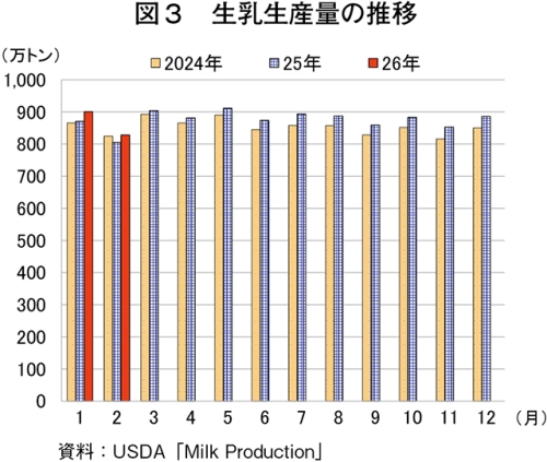 同月の生乳生産量は、乳用経産牛飼養頭数および1頭当たり乳量(同0.6%増)の増加により、828万トン(同2.9%増)とわずかに増加した(図3)。米国農務省経済調査局(USDA/ERS)によると、26年の生乳生産量は1億645万8000トン(前年比1.3%増)と見込まれている。