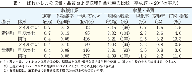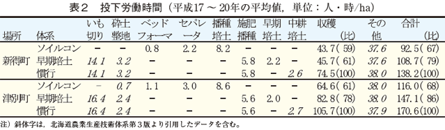 収穫作業能率はソイルコン体系で高く、収穫作業の投下労働時間は慣行体系より約4割減少しました(表2)。栽培期間の合計でみると、慣行体系の場合、新得町で約140時間、津別町で約170時間であったものが、ソイルコン体系では新得町で93時間(慣行体系比67%)、津別町で116時間(同・68%)となりました。このように、ソイルコン体系では、大幅に省力化できることが実証できました。