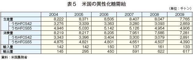 米国の異性化糖消費は、「natural」志向の高まりによる消費者の砂糖回帰などから減少傾向で推移してきており、2009年の消費量は前年比4.0%減の728万トンと見込まれ、5年前と比べて11.4%減少している。また、生産量も前年比3.5%減の777万トン(内訳は、HFCS42が286万トン、HFCS55が491万トン)と見込まれている。しかしながら2010年の生産量については、砂糖価格の上昇に伴う異性化糖の価格優位性から、上半期(1〜6月)で前年同期比6.7%増の410万トンと回復を見せている。