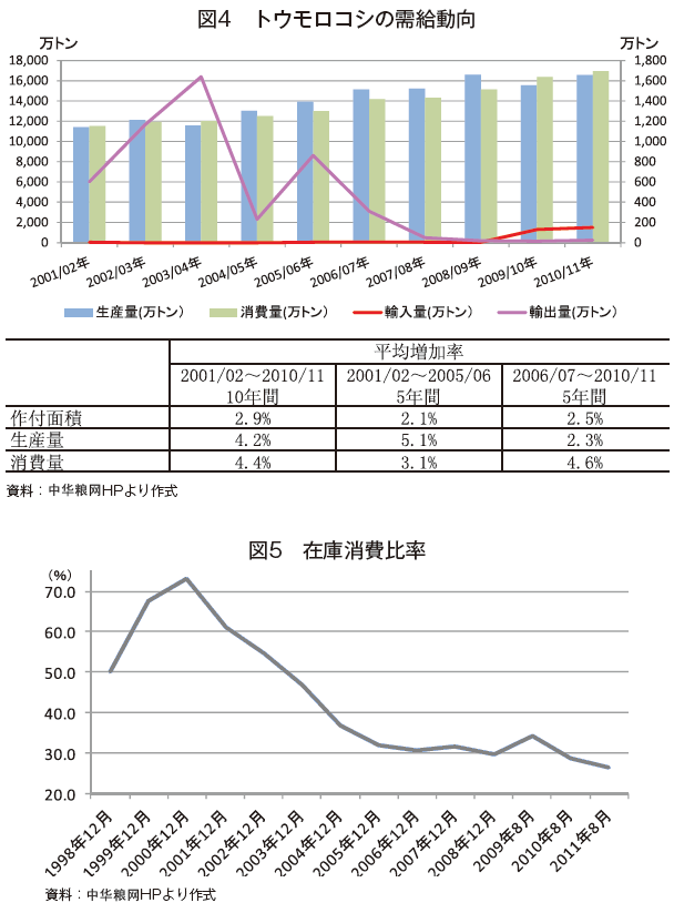 国家資本委員会が直接管理する中央企業である中貯糧総公司傘下の中華糧網によるトウモロコシの需給動向では、作付面積増加傾向で安定的に推移している一方で、生産量の平均増加率は単位収量が停滞している(図2参照)ことから、2006/07〜2010/11年度は2001/02〜2005/06年度に比べ低下した。また、消費量の平均増加率は、2006/07〜2010/11年度は2001/02〜2005/06年度に比べ上昇した。消費量の平均増加率が生産量の平均増加率を上回ったため、消費量に対する在庫量の割合は、2011年8月現在で26.5%と大幅に減少すると見込まれている(図5)。