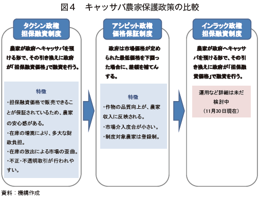 政権与党となったタイ貢献党は、選挙時に掲げたコメの農家保護政策を担保融資制度とし、さらに農家当たりの制度利用上限を定めない―という公約をすでに実行に移している。そのため、キャッサバについても、同様の制度が適用される予定である。そもそも担保融資制度は、前々政権時の2008/09年度まで農家保護政策として実施されていたものである。仕組みを概述すると、農家が政府へ農作物を預ける形をとって、その引き換えに政府が設定した「担保融資価格」で農家に対して融資を行うというものである。これにより、出荷が集中する収穫期に、農作物の市場への出回りが調整され、農家販売価格の低下が回避されることを目的とする。