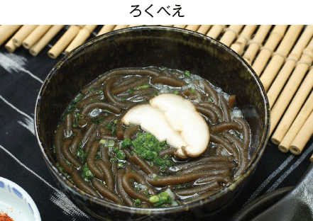 「センダンゴ」を、から臼で粉にし、熱湯で耳たぶぐらいの固さに良くこね、団子にしたものを一度ゆでます。それをさらにこね、沸騰している鍋の上に置いた「ろくべえせぎ」と呼ばれる穴の空いた鉄板から押し出すと、ゆであがって黒い麺になります。これを、メジナや地鶏で取っただしで食べるのが「ろくべえ」です。