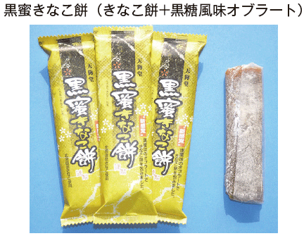 このあらたな風味添加オブラートに黒蜜味を添加し、きな粉を練りこんだ餅と組み合わせことにより、深い香りとコクのある風味が広がる新製品(商品名:黒蜜きな粉餅)が完成しました。黒蜜味のオブラートが口の中で溶け合い風味を深める、「インパクトのある味わい」の画期的な商品となりました。