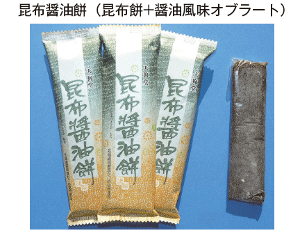 さらにオブラートに風味を添加した商品第2弾として、オブラートに醤油のフレバーを添加したオブラートの開発を行いました。蜜で培った経験のもと、糖分を塩分に変えた風味添加オブラートです。このオブラートと、当社のガゴメコンブ餅とを組み合わせた新製品(商品名:ガゴメ昆布醤油餅)を開発しました。